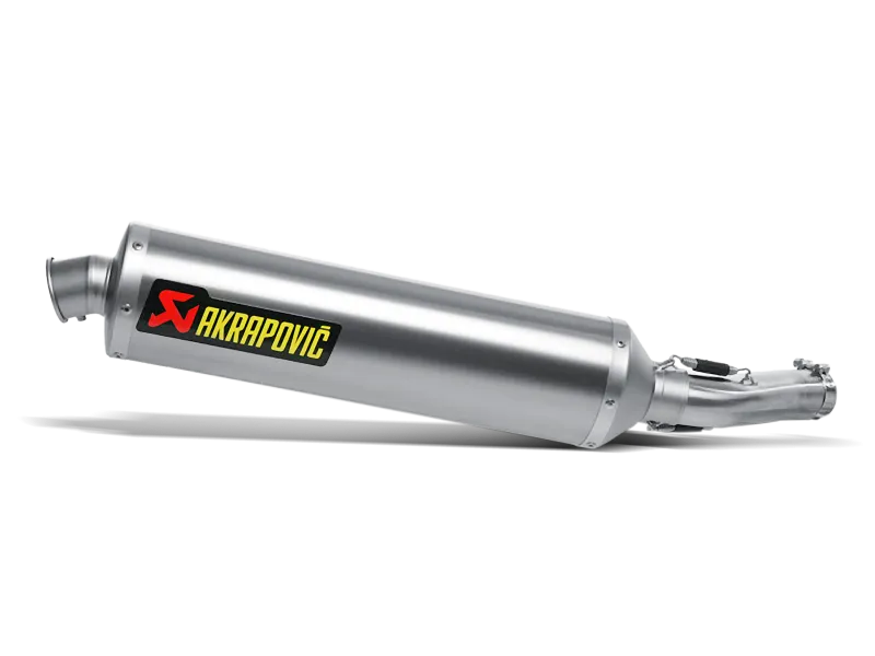 The Akrapovic SLIP-ON exhaust system is a first-level exhaust system tuning component. One of the advantages of this system is that no modifications to the stock header tubes are necessary during instal- lation. It is composed of two main elements: a muffler and a link pipe. The link pipe in this case is made of high- quality stainless steel and is cylindrical in shape. The connections and attachment to the stock header tubes and the muffler are made using free-floating joints held together with high-quality silicon-shielded tensioning springs. A metal clamp is additionally used to fasten the link pipe ‡ stock header assembly joint more securely.