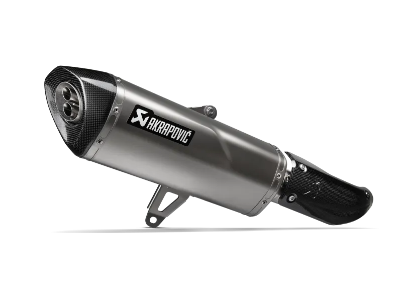 A sandblasted high-grade stainless-steel muffler outer sleeve and link pipe create an exhaust that is 22% (1.3 kg) lighter than the standard stock. The specially profiled surface on the muffler is not only a design feature but also adds greater durability. Finished with a hand-made carbon-fibre end cap, the look is completed with a new heatshield with an embossed Akrapovič logo for a unique appearance and a monochrome Akrapovič logo sticker on the muffler to complete the visual impact.