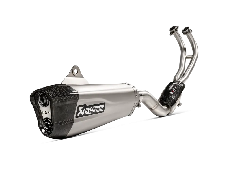 This latest version of the EC/ECE type-approved Racing Line (Titanium) exhaust system is composed of a high-grade titanium muffler outer sleeve – which is sandblasted for a perfect finish – and a stainless-steel link-pipe and headers. It is finished with a carbon-fibre end-cap – a distinctive design with the Akrapovič logo embossed on it. Meeting Euro 5 approval, this complete exhaust system with a new muffler design also comes with a carbon-fibre heat shield, as well as a catalytic converter. Weighing in at 1.9 kg (21.9%) lighter than the standard stock system, the Racing Line (Titanium) offers optimum throttle response and serves up a deep and vivid Akrapovič sound, all from a simple plug-and-play installation with no remapping required.
