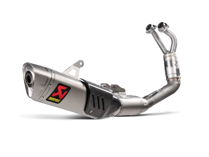 This is an EC/ECE type-approved complete exhaust system constructed with a high-grade, lightweight titanium outer sleeve and end-cap for the muffler, with a stainless steel link pipe and headers, weighing in at 0.7 kg lighter than the standard stock exhaust. A catalytic converter is included in the package, complying with the current Euro5 approvals. There are performance increases of 1.5 kW (2.0 hp) at 9,200 rpm and an added +1.1 Nm at 5,000 rpm when tested on the Akrapovič dyno against a standard stock exhaust. The deep, vivid sound complements the bike’s sporting credentials. Designed to match the bike’s lines, the pre-muffler is located under the main body and is hidden by the fairing, leaving the muffler to exit on the right side of the machine. The system is finished with a hand-crafted carbon-fibre heatshield.