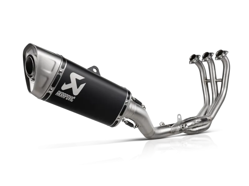 This exhaust has a lightweight black coated titanium muffler outer sleeve, combined with stainless steel link pipes and headers and finished with a titanium end cap.. The new design features a shorter muffler for an enhanced sporty look, which exits on the side of the bike for visual impact. Power is increased by 3.3 kW (4.5 hp) at 9,600 rpm when compared in back-to-back tests on a MT-09 with a Racing Line (Carbon) exhaust and a standard stock exhaust system. The sporty racing sound is perfectly tuned to the engine. It is designed for use on tracks and closed-course competition circuits.