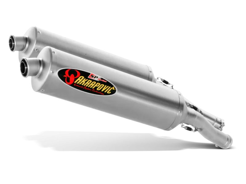 The Akrapovic SLIP-ON SP series exhaust system is composed of two sets of cylindrical stainless steel link pipes and mufflers. The muffler and link pipe are attached with a sleeve joint secured with silicon-shielded springs. The Akrapovic Slip-On system is also attached to the stock header assembly using a sleeve joint, but here it is secured with a metal clamp. The muffler outer sleeve is available in either titanium or carbon-fiber. The muffler is attached to the frame using an Akrapovic carbon-fiber clamp.